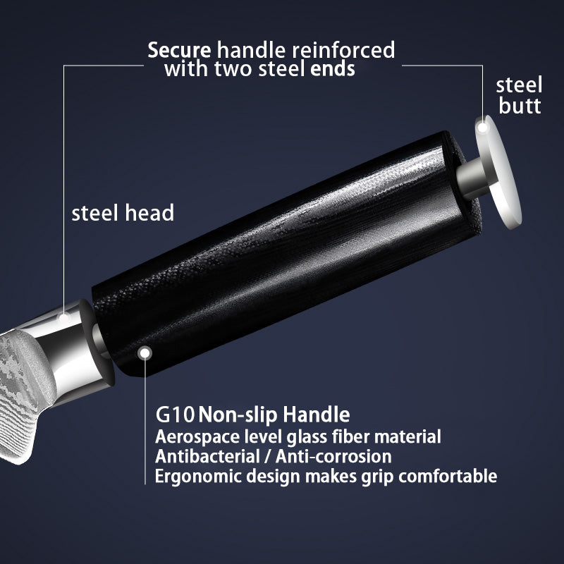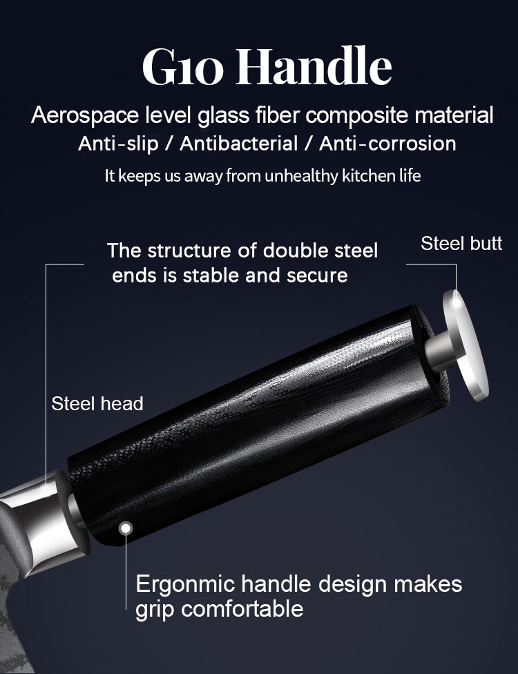 AESTHETIC & ERGONOMIC HANDLE - The beautiful G10 handle creating a simple aesthetic and ensuring comfort and maneuverability. The fully forged full tang delivers maximum strength and perfect balance.