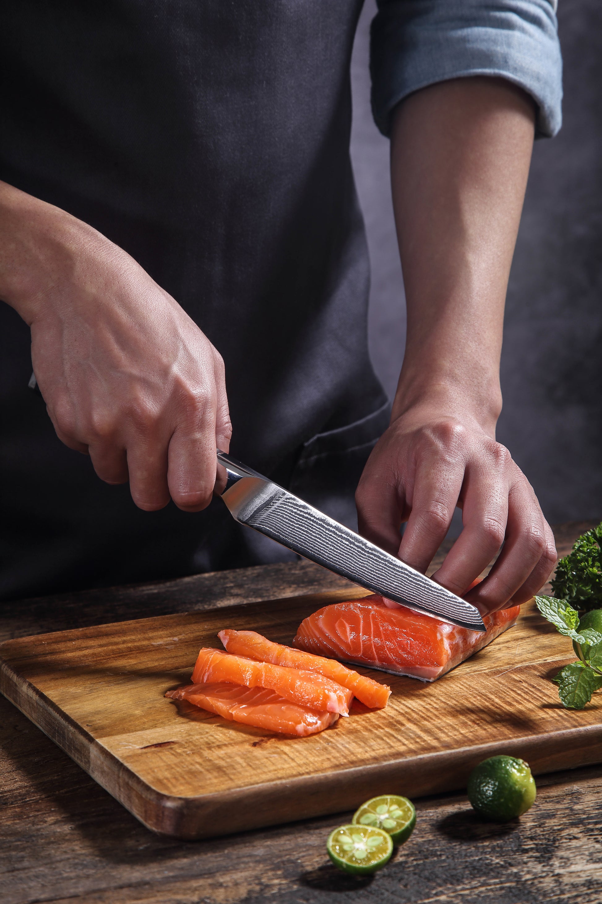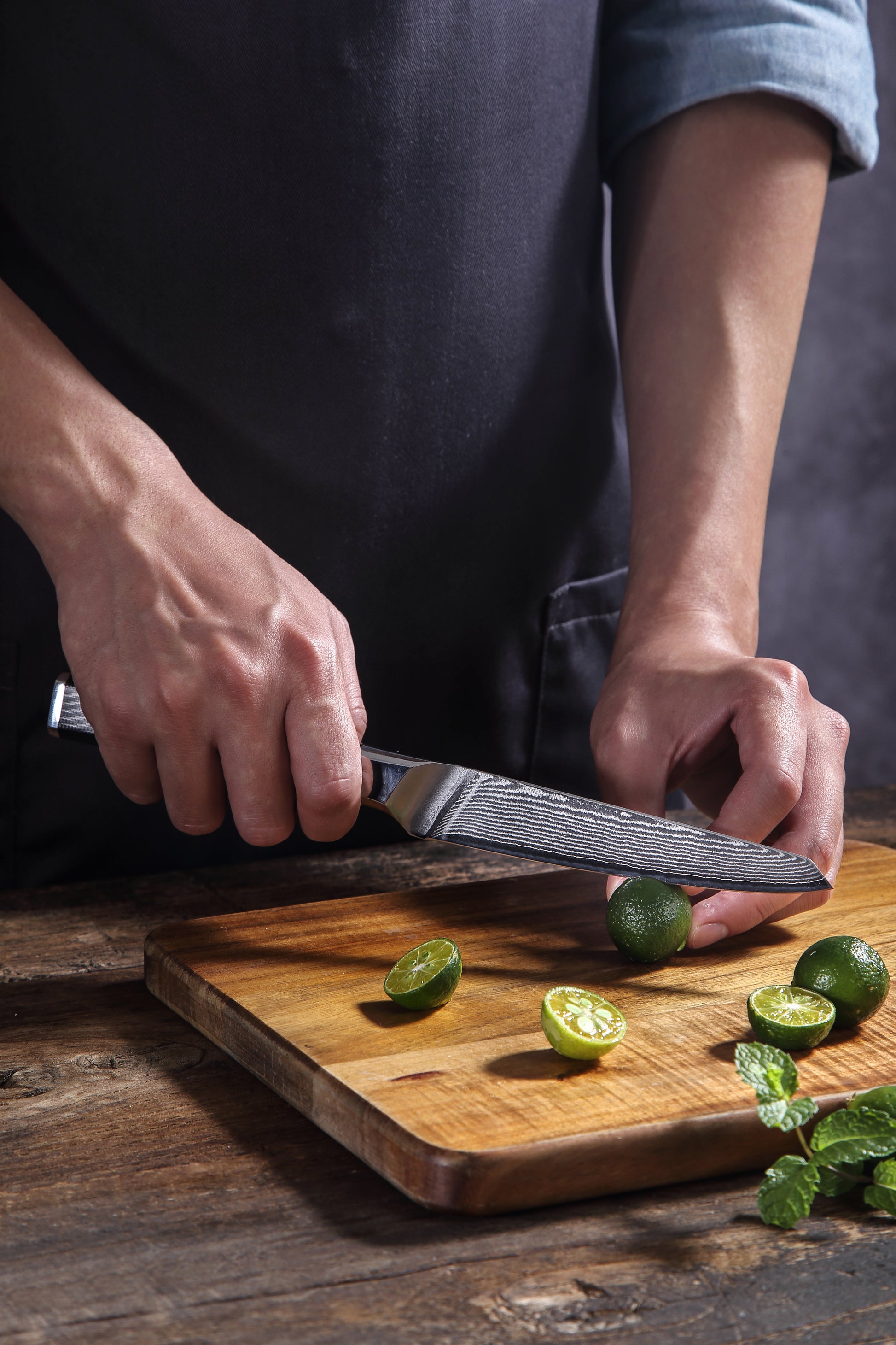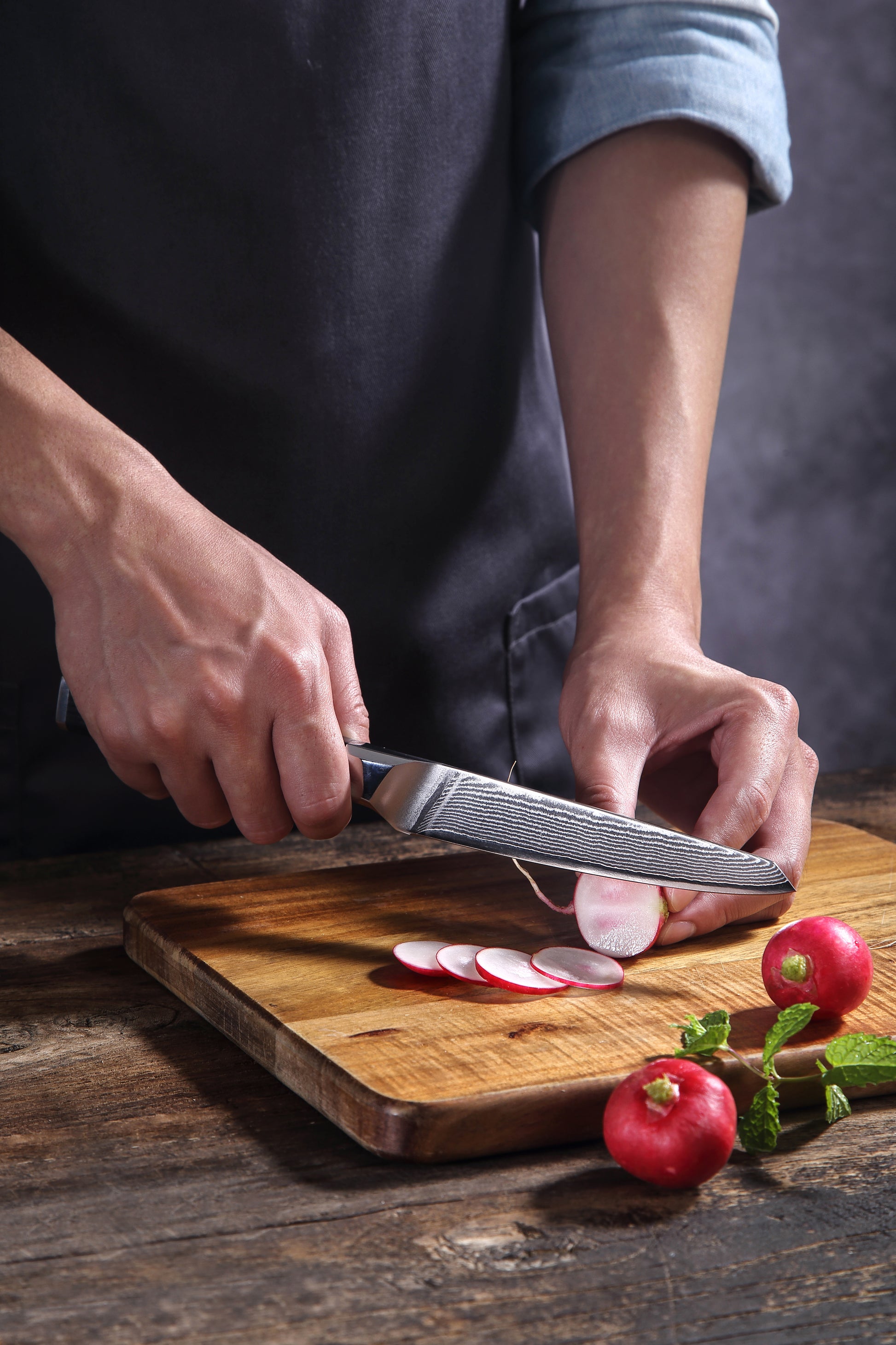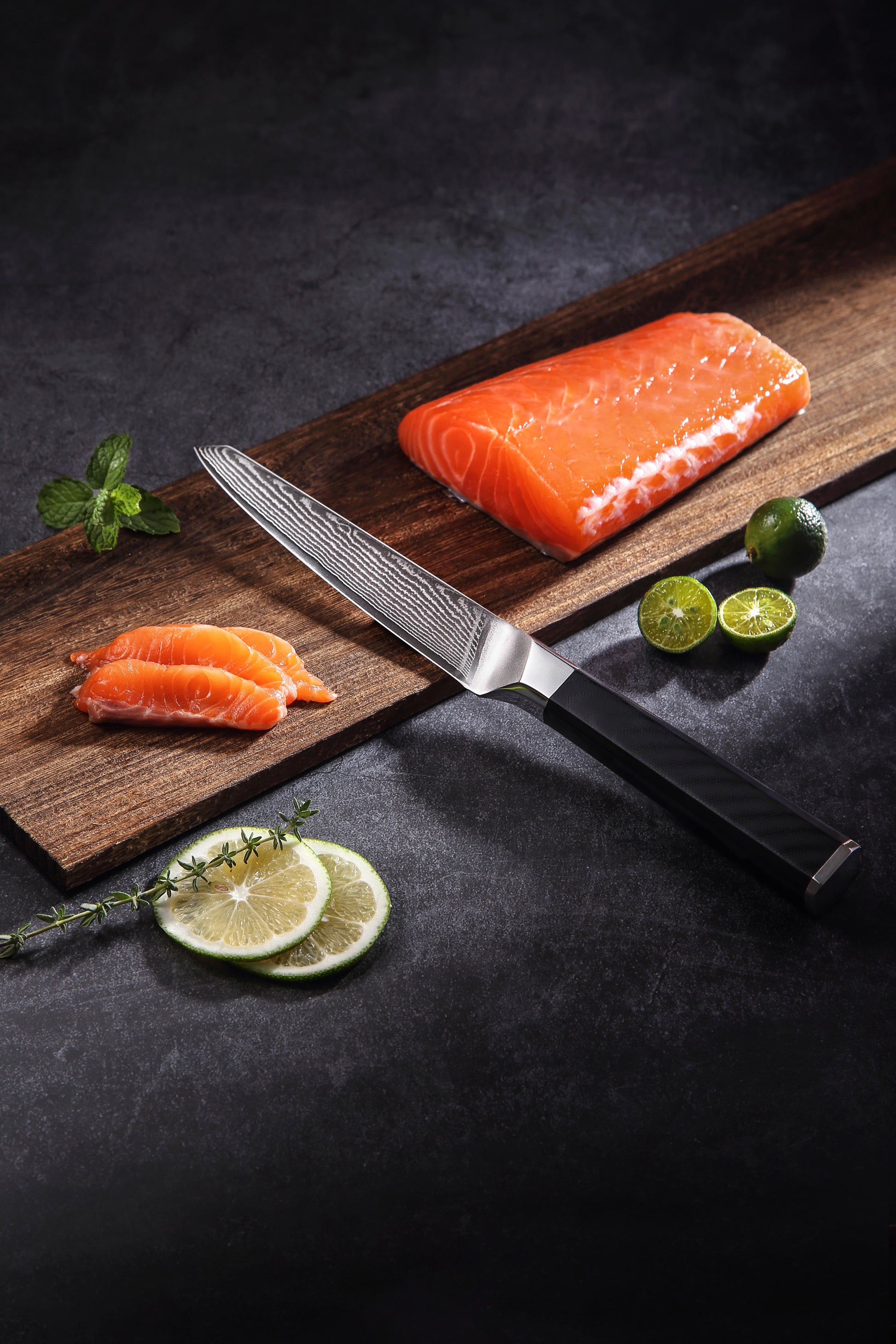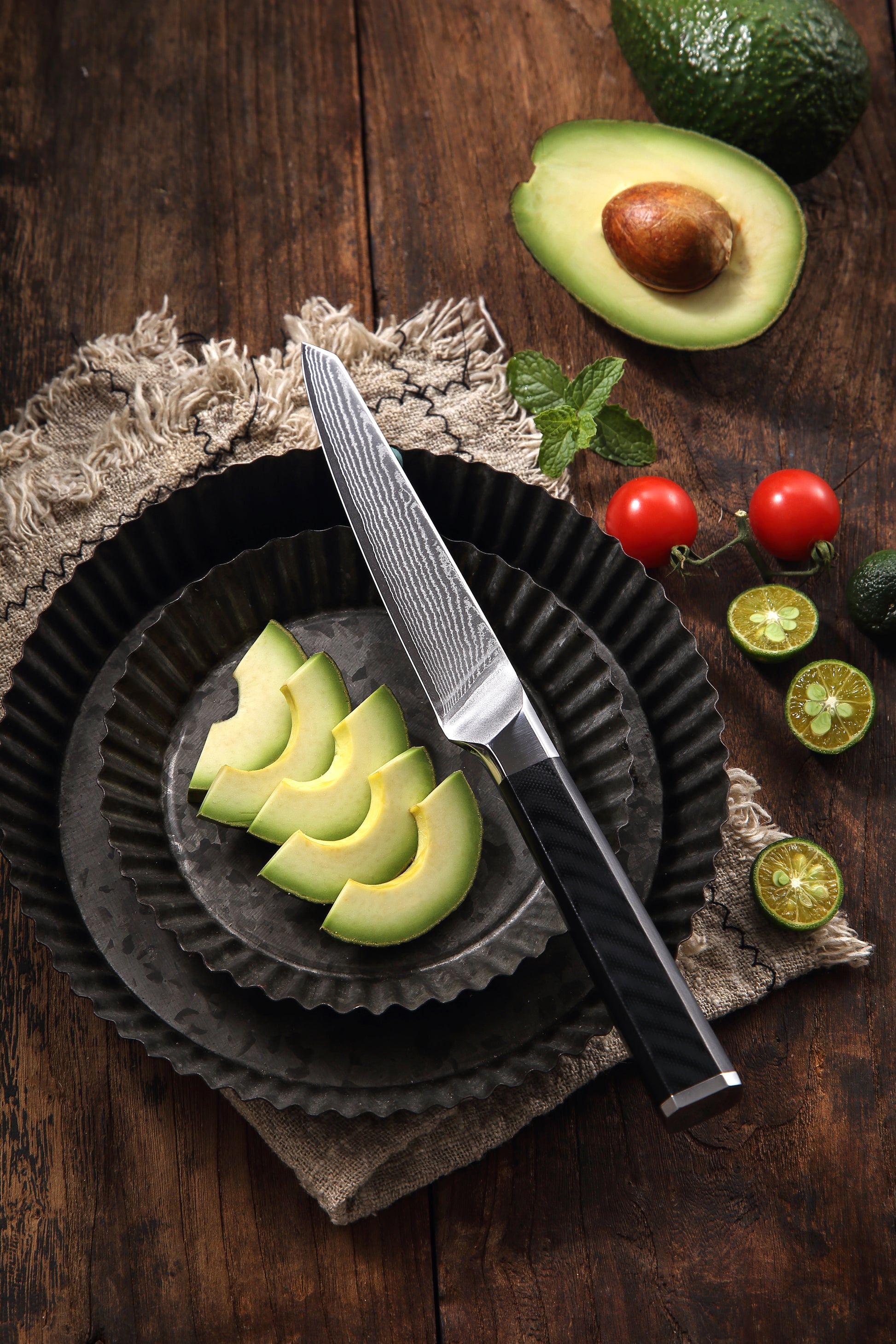 PERMIUM MATERIAL - 5 inch Professional Utility Knife Made of 67 layers permium damascus steel that has wonderful hardness can handle most kitchen tasks, such as cutting, slicing, dicing, and mincing.