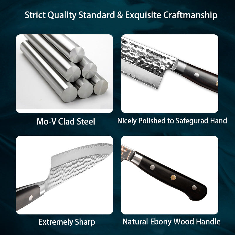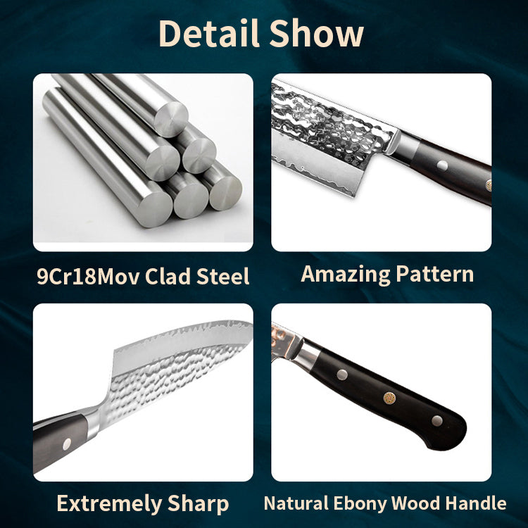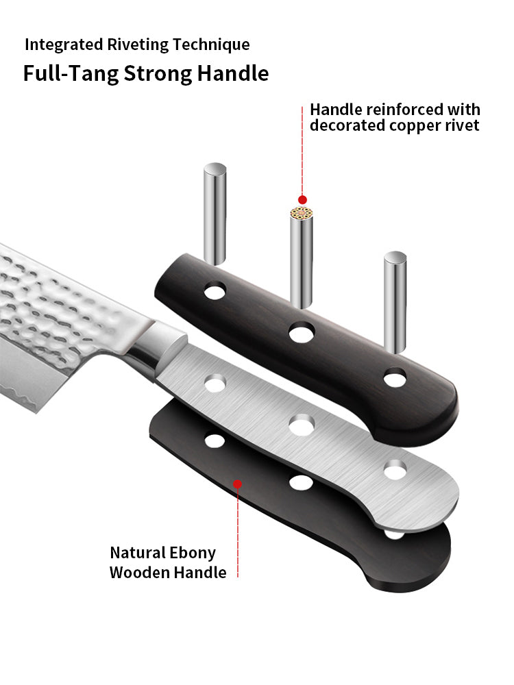 Non-Stick Hammered Pattern: The hammered pattern not only adds to the knife’s striking appearance but also helps reduce friction, preventing food from sticking to the blade while cutting.