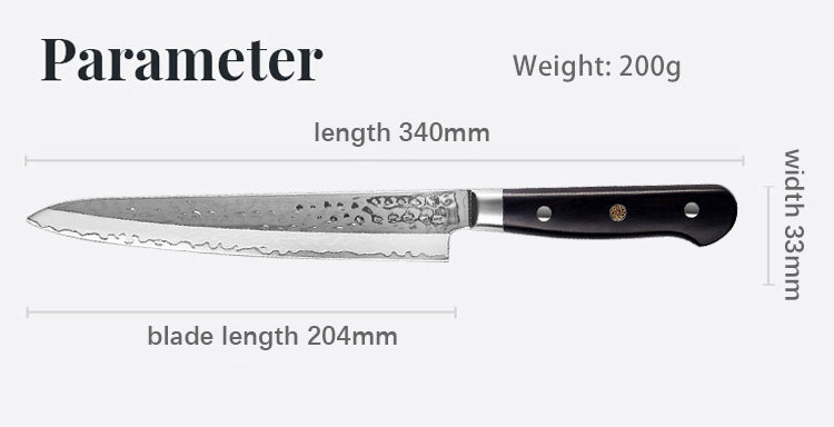 Crafted for chefs and cooking enthusiasts who demand precision, durability, and elegance, our 8" Carving Knife is a true masterpiece in both form and function. Featuring a 9cr18Mov high-quality steel core and 9 layers of composite steel, this knife offers exceptional sharpness and long-lasting performance. Whether you're slicing, dicing, or chopping, the blade ensures effortless cuts with minimal effort.